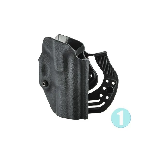 External high-resistance technopolymer belt holster. Equipped with screw for retention adjustment and two adjustable attachments, one with belt loop and one paddle.Â